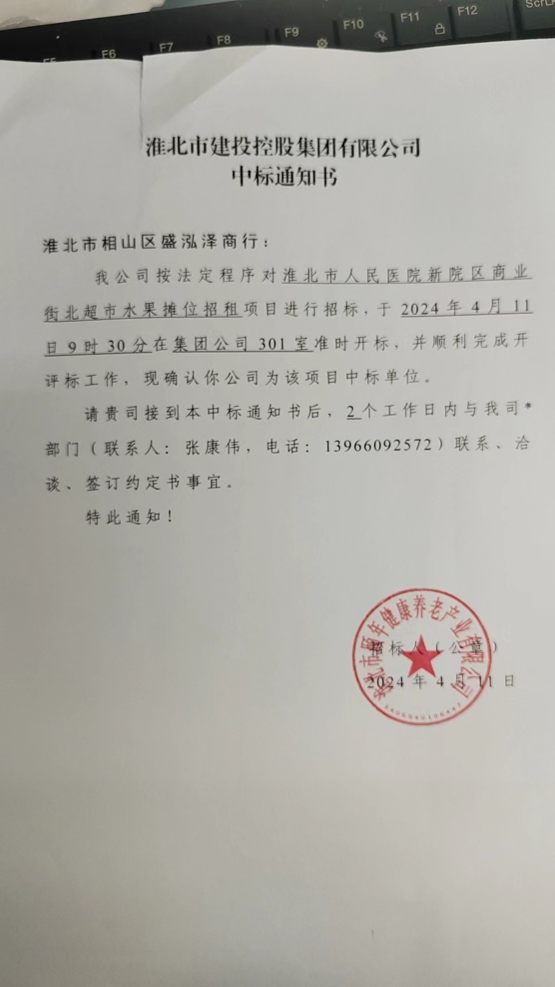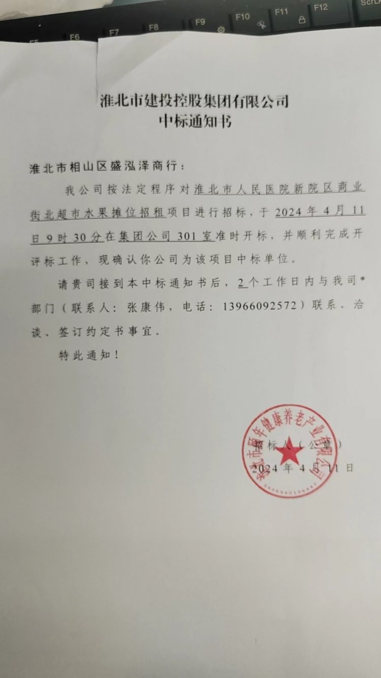 我公司按法定程序?qū)?/span>淮北市人民醫(yī)院新院區(qū)商業(yè)街北超市水果攤位招租項(xiàng)目進(jìn)行招標(biāo),于20244119時(shí)30分集團(tuán)公司301室準(zhǔn)時(shí)開(kāi)標(biāo),并順利完成開(kāi)評(píng)標(biāo)工作,現(xiàn)確認(rèn)你公司為該項(xiàng)目中標(biāo)單位。