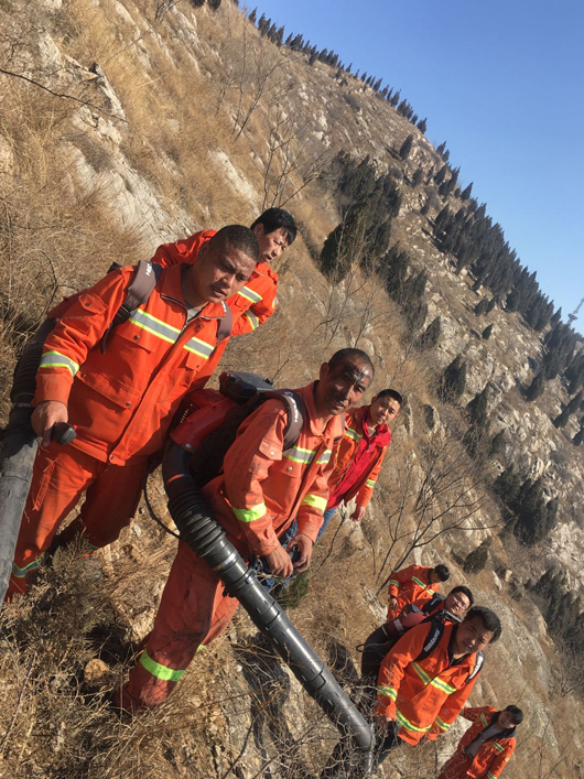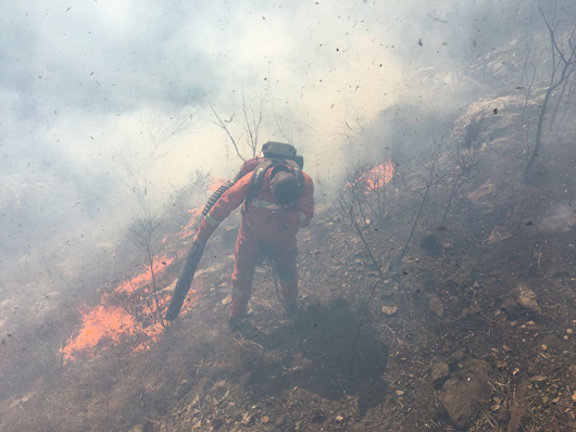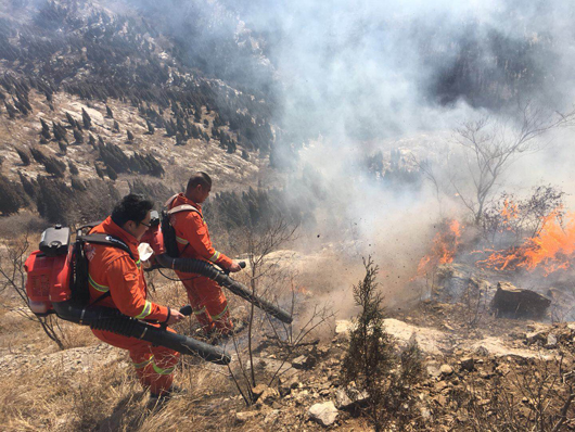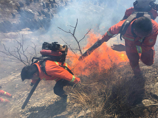 由于火場山體陡峭,碎石、斷坡及帶刺植被較多,大量灌木阻隔而且風(fēng)向飄忽不定,隊(duì)員們行進(jìn)極其困難,護(hù)林隊(duì)員幾次被山火裹入其中,很多隊(duì)員被刺傷和扭傷,但是大家顧不上傷痛,追趕火頭,頑強(qiáng)與火災(zāi)做斗爭。由于現(xiàn)場風(fēng)大火猛煙濃,很多隊(duì)員被熏的眼淚直流,個(gè)別隊(duì)員被火燒焦了眉毛頭發(fā)和衣服,稍不留神就被濃煙和大火困在灌木叢中進(jìn)退不得,就是在這樣惡劣的條件下,大家眾志成城終于把瘋狂的火災(zāi)消滅。