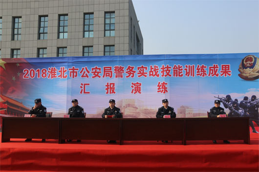 2018年12月25日上午9:25分,淮北市公安局警務(wù)實戰(zhàn)技能訓(xùn)練成果匯報表演在市交警支隊訓(xùn)練基地拉開序幕。淮北市公安局黨委書記兼公安局長章銀發(fā)以及公安局所有二級機構(gòu)人員參加。